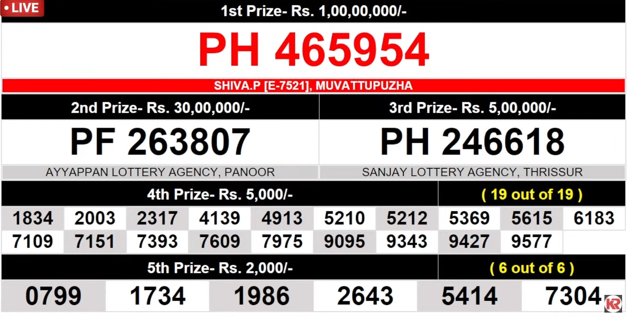 1 करोड़ रुपये के प्रथम पुरस्कार के लिए विजेता नंबर है पीएच 465954 (मोवत्तुपुझा)