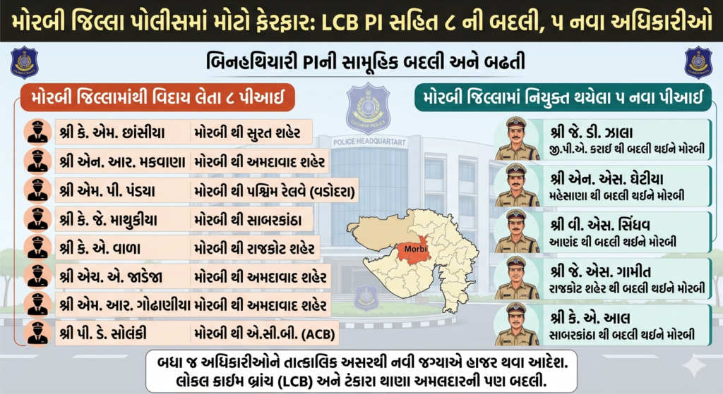 मोरबी पुलिस बल में बड़ा बदलाव: PI समेत 8 अधिकारियों का तबादला, 5 नए चेहरे शामिल