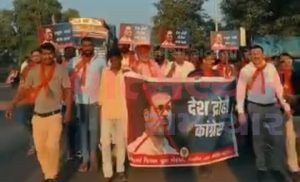 कलोल BJP युवा मोर्चा ने ‘कांग्रेस हाय हाय’ के बैनर लेकर राहुल गांधी के पुतले को लात मारकर विरोध जताया।
