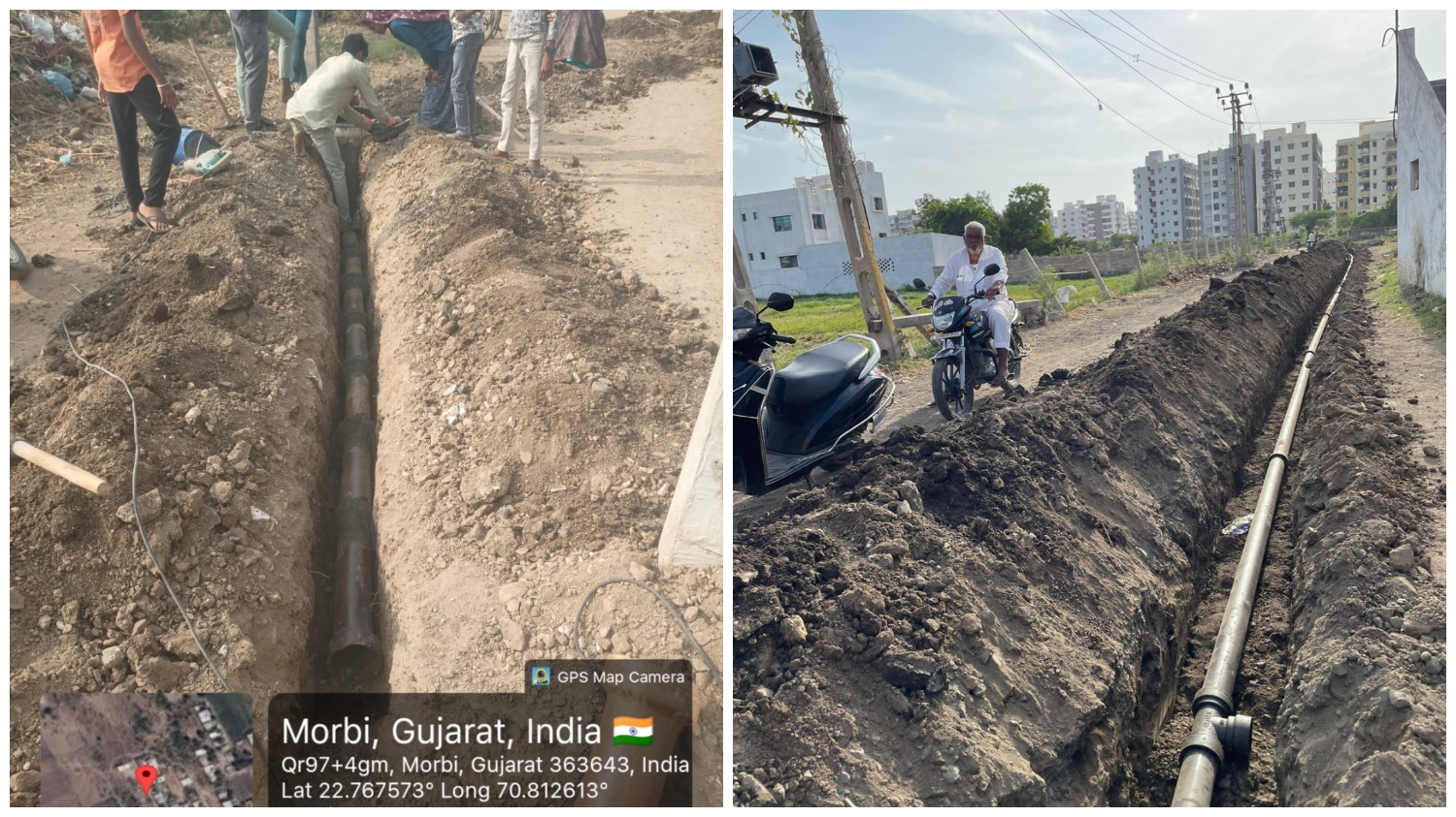 मोरबी नगर निगम सीमा के अंदर वाडी इलाके में ड्रेनेज लाइन और पानी की लाइन का काम चल रहा है।