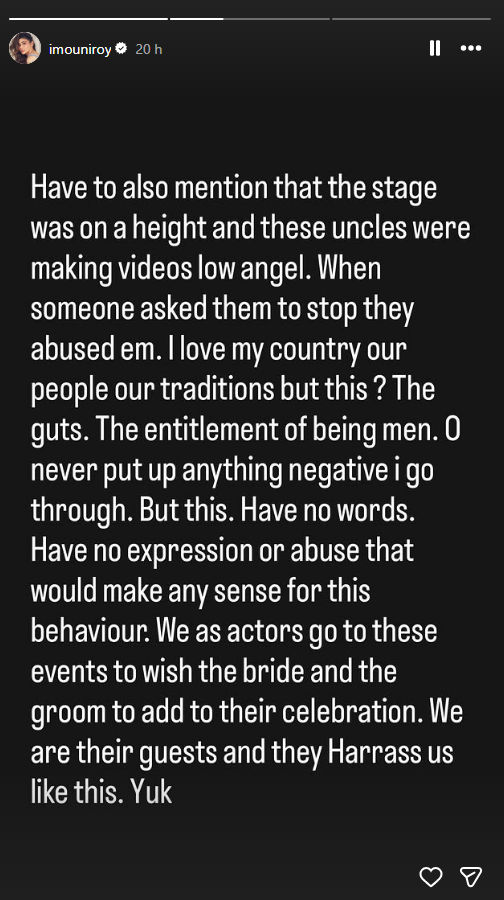 मौनी रॉय ने अपनी पोस्ट में एक चौंकाने वाला खुलासा किया कि स्टेज पर परफॉर्मेंस के दौरान भी हालात गंभीर थे। दो लोग स्टेज के ठीक सामने खड़े होकर उन्हें गंदे इशारे कर रहे थे और भद्दे कमेंट्स कर रहे थे। जब मैंने उन्हें प्यार से रोकने की कोशिश की, तो उन्होंने मुझ पर गुलाब फेंकना शुरू कर दिया। इस बदतमीज़ी से तंग आकर मैं एक समय स्टेज छोड़कर चली गई, लेकिन प्रोफेशनलिज़्म बनाए रखने के लिए मैं वापस लौटी और अपनी परफॉर्मेंस पूरी की।