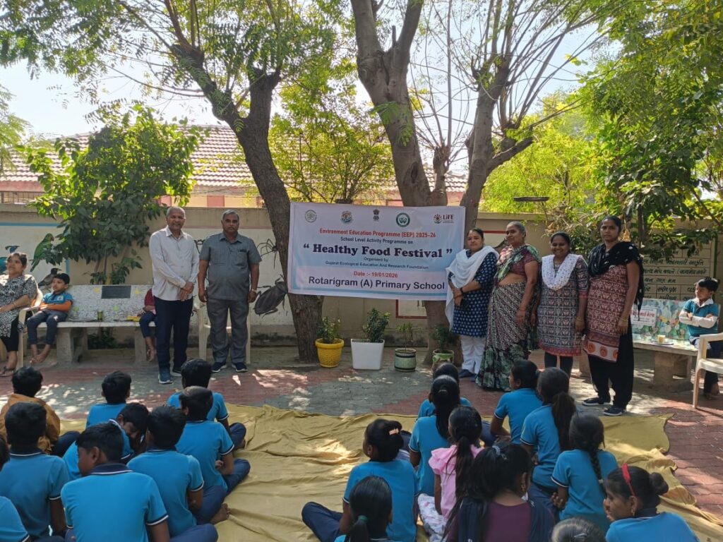 श्री रोटरीग्राम (ए.) प्रा. स्कूल, टी.जी. :- मोरबी मुकामे दिनांक :- 19/1/2026 को गिर फाउंडेशन गुजरात इकोलॉजिकल एजुकेशन एंड रिसर्च गांधीनगर ने हेल्दी फूड फेस्टिवल कार्यक्रम का आयोजन किया।