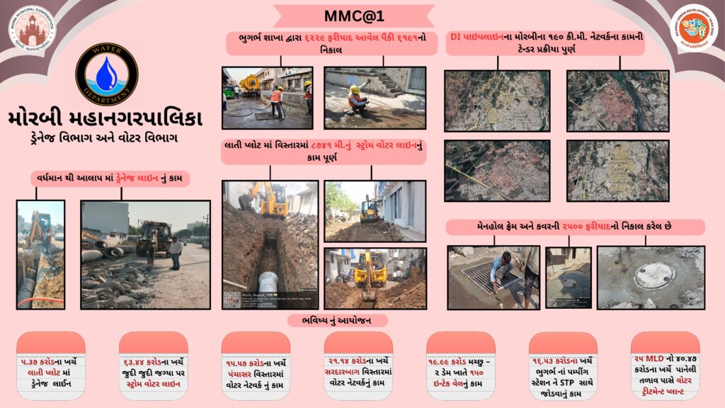 मोरबी शहर में, 1.37 करोड़ की अनुमानित लागत से 1480 मीटर भूमिगत के 3 अलग-अलग काम पूरे हो चुके हैं। आने वाले समय में 2.96 करोड़ की लागत से 3500 मीटर के 6 काम शुरू किए जाएंगे। लाटी प्लॉट क्षेत्र में 8741 मीटर स्टॉर्म वॉटर लाइन का काम पूरा हो चुका है। आने वाले समय में, 5.37 करोड़ की लागत से लाटी प्लॉट में ड्रेनेज लाइन बिछाने और 63.44 करोड़ की लागत से 11 अलग-अलग जगहों पर बारिश के पानी के निपटान के लिए स्टॉर्म लाइन बिछाने का काम जल्द ही शुरू किया जाएगा। खुले सीवर को कवर करने के लिए, नगर दरवाजा और दरबार गढ़ क्षेत्र (पुरानी मोरबी) में रुपये की लागत से ड्रेनेज का काम किया जाएगा। फेज 1 में 11.84 करोड़ और फेज 2 में 10.10 करोड़ रुपये की लागत से लायंस नगर, महेंद्रपारा, माधापार वगैरह में ड्रेनेज का काम किया जाएगा। 16.53 करोड़ रुपये की लागत से अंडरग्राउंड पंपिंग स्टेशन और STP से कनेक्शन की योजना बनाई गई है। नगर निगम की सीमा के अंदर अंडरग्राउंड सीवरेज के 12 अलग-अलग पंपिंग स्टेशनों की मरम्मत और रखरखाव 2 साल तक 5.45 करोड़ रुपये की लागत से किया जाएगा। GUDC (अंडरग्राउंड सीवरेज स्कीम) के तहत 120 अलग-अलग वाडी इलाकों में 52 km लाइनें पूरी हो चुकी हैं।